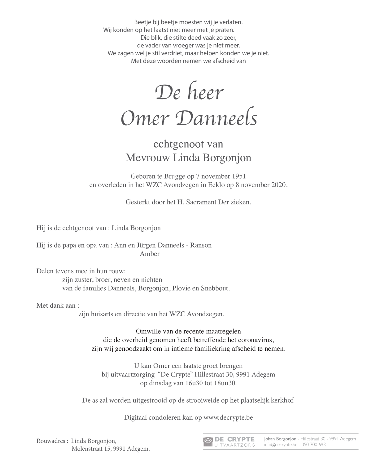 Overleden te Eeklo (9900) op zondag 8 november 2020 op 69-jarige leeftijd